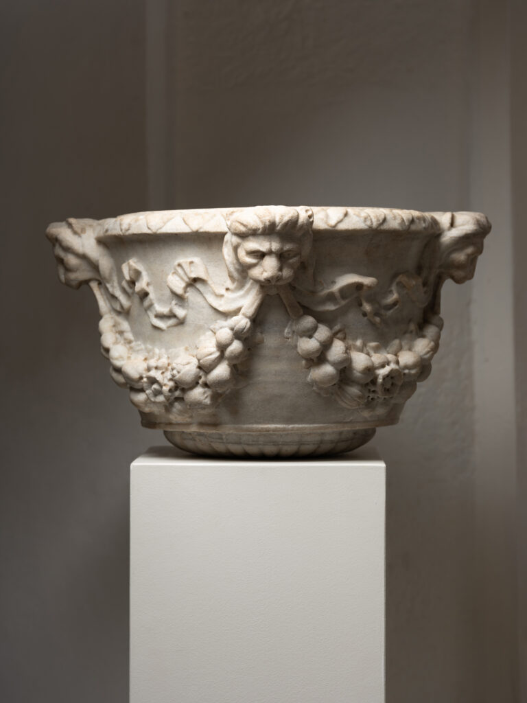 Ainsi ce bassin témoigne de la capacité des artistes italiens du XVᵉ siècle à fondre l’héritage antique dans une création profondément humaniste. La matière du marbre, polie et patinée, confère à l’oeuvre une présence tangible et noble, tandis que la rigueur symétrique du décor évoque l’ordre et la mesure recherchés par les sculpteurs de la Renaissance. Par la vitalité de ses guirlandes, la majesté de ses lions et l’équilibre de sa composition, ce vase se présente comme un manifeste de la sculpture all’antica : un objet à la fois ornemental, symbolique et spirituel, célébrant la puissance de la nature, la force du gardien et l’idéal de beauté hérité de l’Antiquité.
