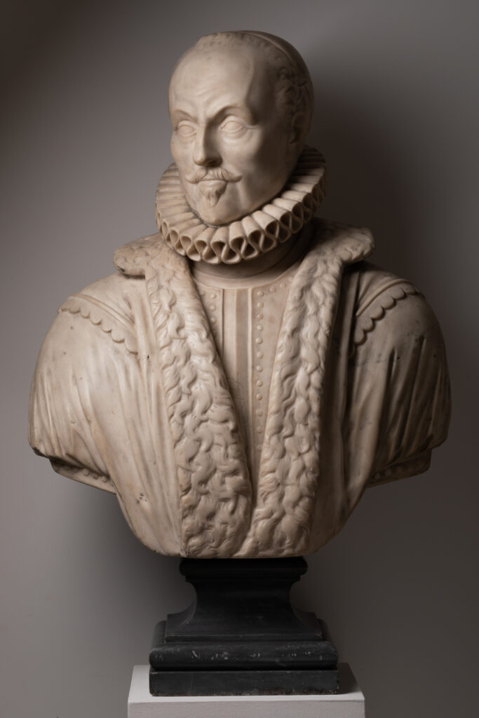 Ce majestueux buste en marbre représente un homme d’âge mûr, vu de face avec la tête légèrement tournée vers la droite. L’homme porte une fraise autour du cou, une armure et un grand col de fourrure qui descend jusqu’en bas du buste. Le visage est grave, sérieux et solennel. L’homme arbore une petite moustache légèrement relevée, une barbichette et porte sur le haut du crâne un petit bonnet. Les différents éléments de ce buste nous laissent à croire qu’il s’agit de la représentation d’un homme important, d’origine noble, à la carrière militaire longue et particulièrement dévot. Après l’étude de plusieurs portraits nous pouvons avancer le nom de Guillaume d’Orange.