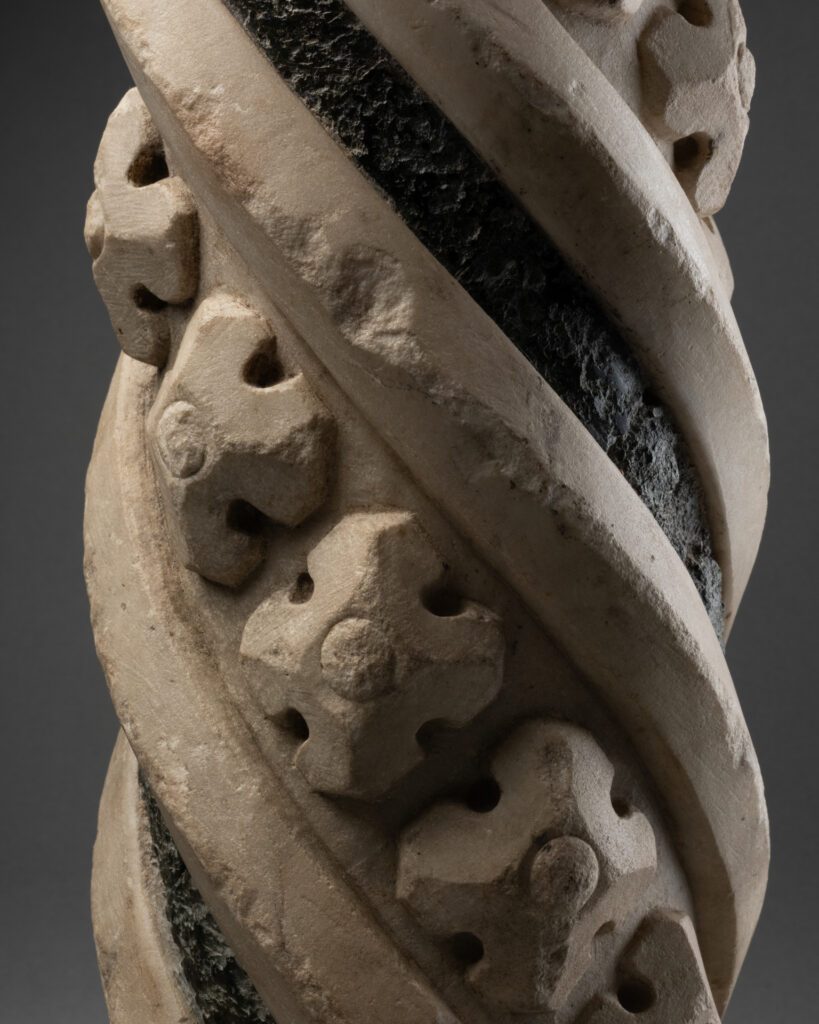 Avant le XIIIᵉ siècle, les colonnes architecturales avaient surtout une fonction structurelle et décorative. Notre colonne s’inscrit dans une tradition gothique italienne, où les artistes adaptent l’héritage antique aux nouvelles exigences esthétiques et spirituelles, l’ornementation prend un sens symbolique et spirituel plus marqué. Des exemples comparables se retrouvent dans le cloître de la basilique Saint-Paul-hors-les-Murs à Rome, où les fûts spiralés rythment l’espace et accompagnent la lumière sacrée, conférant à la pierre un mouvement. La torsade, encadrée par les filets latéraux, guide le regard et organise la surface, tandis que les motifs à quatre lobes ponctuent la spirale avec élégance, créant un équilibre entre dynamisme et rigueur.