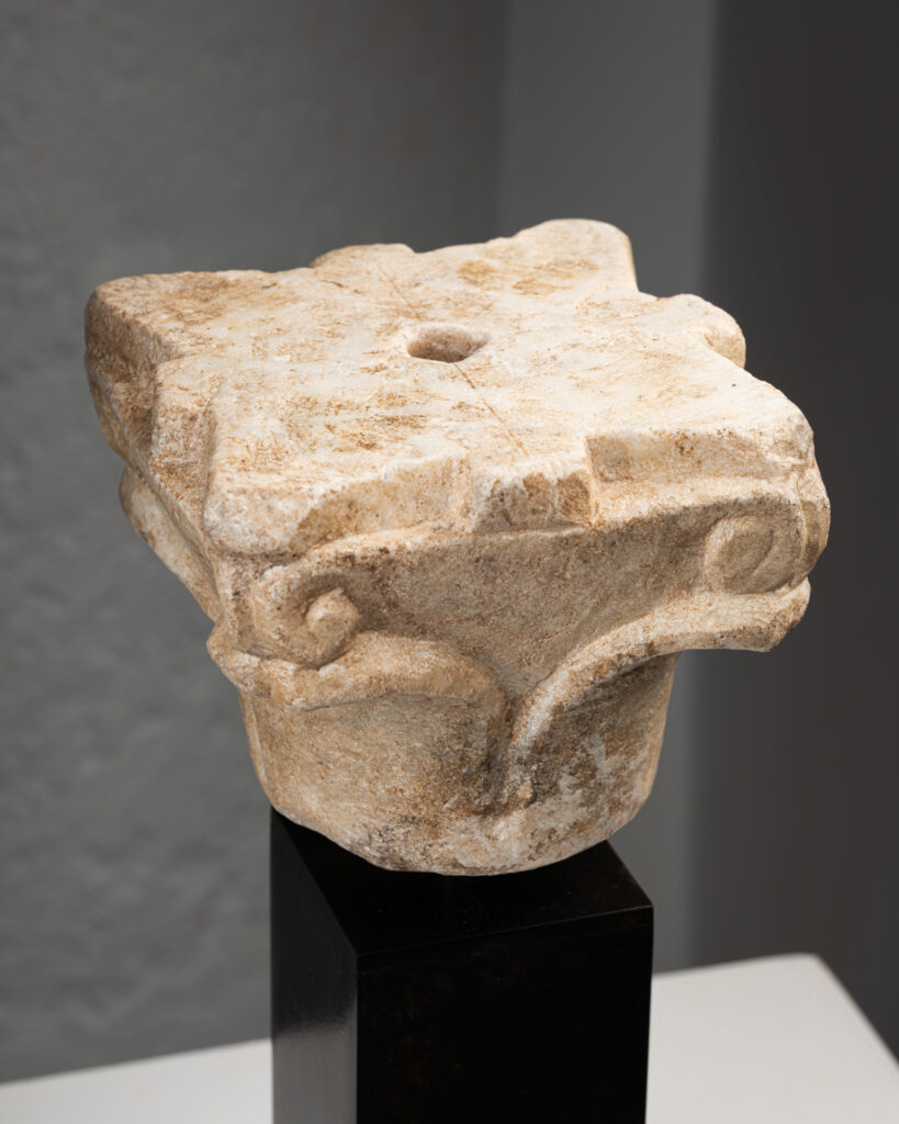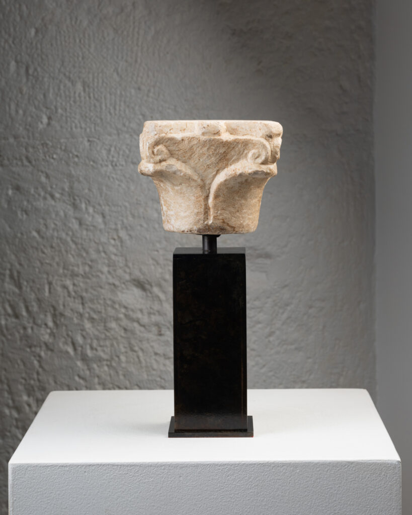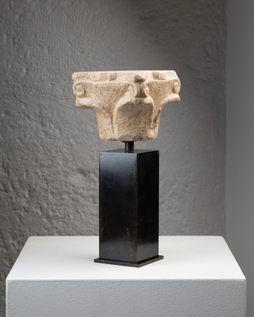 Ce petit chapiteau en marbre blanc, légèrement veiné, d’origine italienne, peut être situé à la charnière entre l’époque romane et le début de l’époque gothique. Sculpté sur toutes ses faces, il présente une corbeille ornée de motifs végétaux stylisés, notamment des feuilles d’eau aux extrémités arrondies, ainsi que des crochets et des formes évoquant des crosses aux angles.