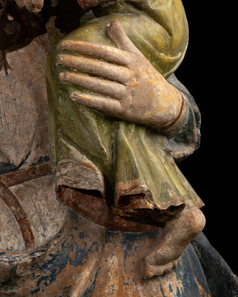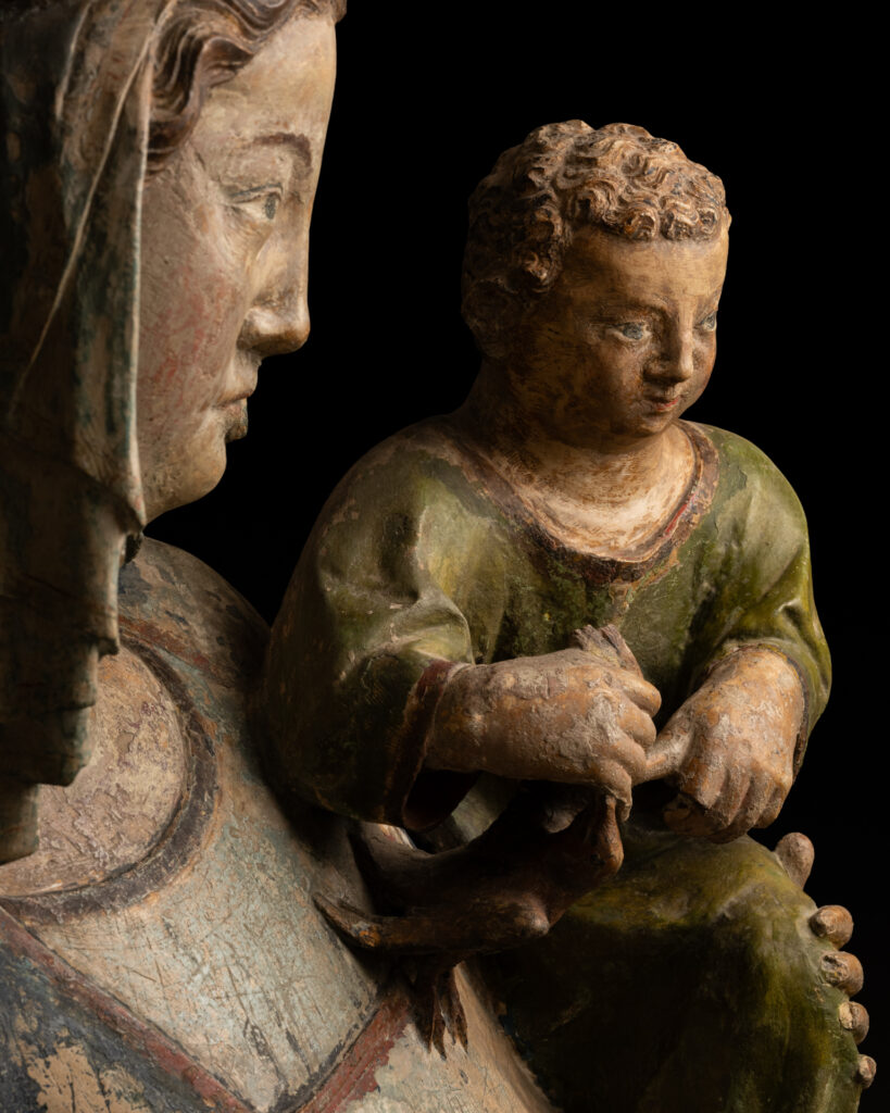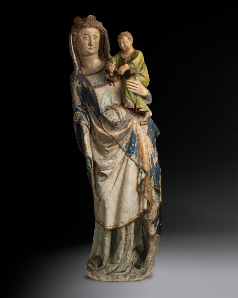 Véritable joyau de la statuaire gothique, la Vierge à l’Enfant de Cirey-sur-Vezouze force l’admiration par son niveau de raffinement et par sa monumentalité. Haute de 171 cm, à la silhouette fortement allongée et en contrapposto, elle fait partie des plus impressionnantes sculptures lorraines du premier tiers du XIVème siècle, faisant mentir les traditionnels descriptifs de cette typologie d’oeuvres utilisant les termes de silhouette ramassée, trapue ou robuste. L’oeuvre est influencée par la sculpture « courtoise » d’Ile-de- France de la fin du XIIIème siècle, notamment par sa silhouette exagérément curviligne, son manteau remontant en tablier sur le devant de sa robe et par l’iconographie de l’enfant tenant un oiseau. Toutefois elle emprunte aussi à l’École lorraine ses particularités : cous épais, visages en écusson, yeux en amandes et oreilles décollées pour l’Enfant. Conservée jusqu’au début du XIXème siècle dans l’église abbatiale de Haute-Seille (Meurthe et Moselle), filiale de la célèbre abbaye de Morimond, elle témoigne de la place capitale de l’iconographie mariale dans l’art cistercien du XIVème siècle. Malgré les vicissitudes de l’histoire de cette abbaye, elle présente un état de conservation remarquable.