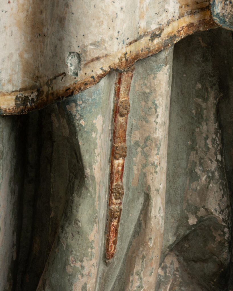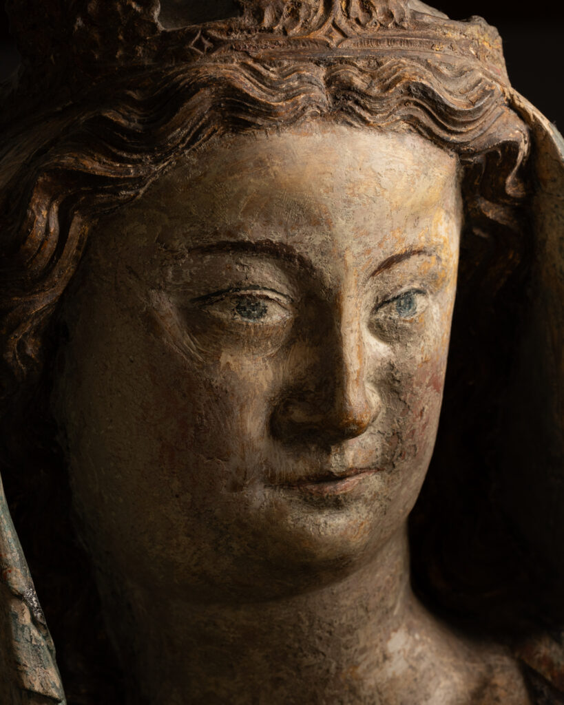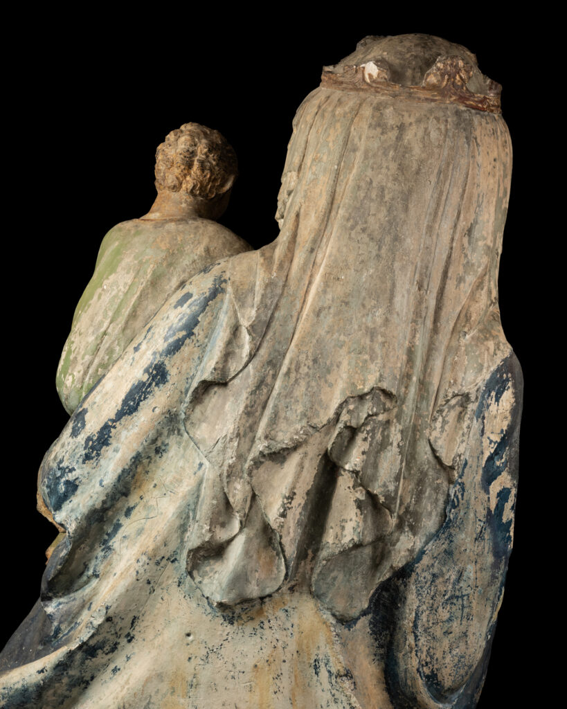 Taillée en fort relief dans un seul grand bloc de calcaire au grain serré, cette majestueuse madone se tient debout dans un fort contrapposto représentant un moment de grande tendresse. Elle porte sur la hanche gauche l’Enfant Jésus vêtu d’une tunique longue et pointant de son index (manquant) un petit oiseau qu’il tient fermement de la main droite. Ce détail iconographique, hérité du vocabulaire marial parisien, traduit à la fois l’innocence de l’Enfant et le pressentiment de sa Passion, l’oiseau étant traditionnellement associé au sacrifice à venir. La Mère de Dieu est coiffée d’un voile court et d’une couronne à fleurons qui encadrent son visage plein et large à l’expression pensive entouré d’une belle chevelure ondulante. Son bras droit se dégageait originellement de deux pans de son manteau tombant en cascade de plis aujourd’hui accidentés. Le pan intérieur du manteau est relevé en oblique sur le devant de la robe. Il cache en grande partie une ceinture à motifs de rosettes, attribut vestimentaire largement diffusé dans l’iconographie du XIVème siècle et considérée comme symbole de la virginité de la Vierge. Le réseau raffiné de plis du drapé du manteau dont les bordures sont suggérées par un délicat liseré accompagne, par un relief assez discret, les profonds creux des plissés de la robe en partie inférieure. Quoiqu’accidenté, le revers présente une exécution extrêmement soignée par le jeu savant du voile court et des plis à bec latéraux du manteau mettant en valeur la gracieuse silhouette curviligne. La sculpture présente par endroit au moins quatre couches de polychromie, témoignant des soins prodigués au cours des siècles à cet objet de culte très important.